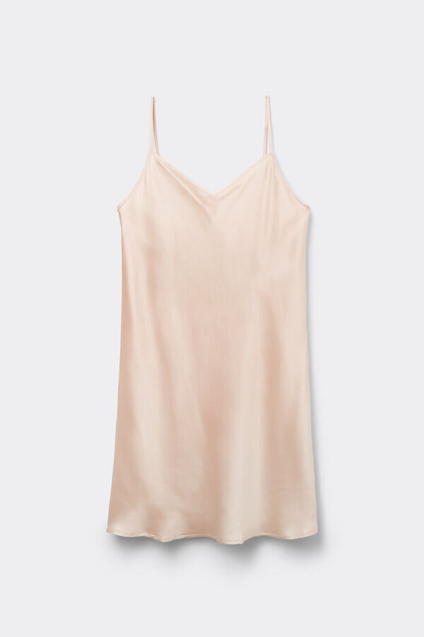 gładka jedwabna halka z regulowanymi, cienkimi ramiączkami i subtelnym dekoltem w szpic. idealna do noszenia pod sukienkami, aby uzyskać elegancką sylwetkę. Modelka ma 175 cm wzrostu i nosi rozmiar S.