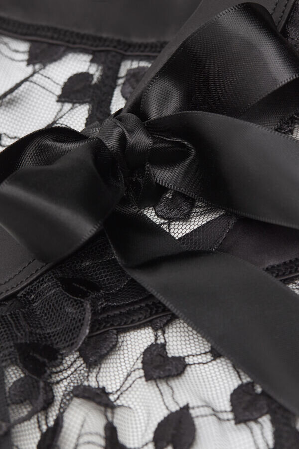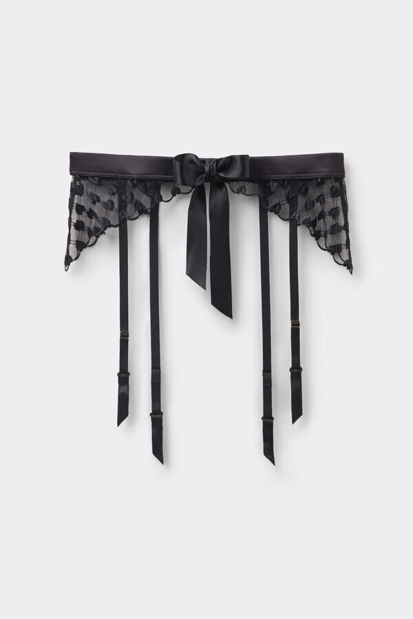 pas do pończoch z romantycznym tiulem z haftowanym sercem i zmysłową satynową lamówką. satynowy pasek jest odpinany i może służyć również jako figlarny choker lub ozdoba do włosów.p>