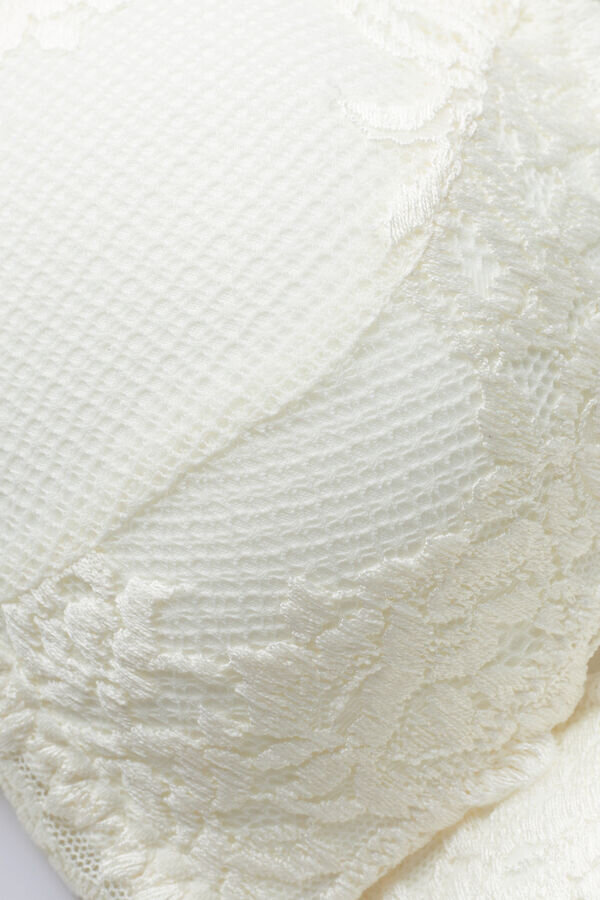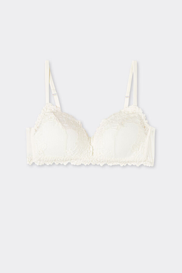 biustonosz trójkątny Tiziana bez fiszbin z lekko wyściełanymi miseczkami i bocznymi fiszbinami, które delikatnie modelują biust. Wykonany jest z wyrafinowanej i eleganckiej elastycznej koronki z haftem kwiatowym w kolorze ton w ton lub kontrastowym, w zależności od wersji. Ramiączka są podszyte mikrofibrą i mają regulację z tyłu. Biustonosz delikatnie modeluje biust i zapewnia lekkie wsparcie.
