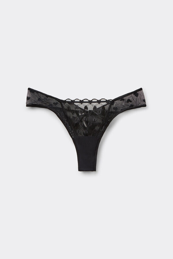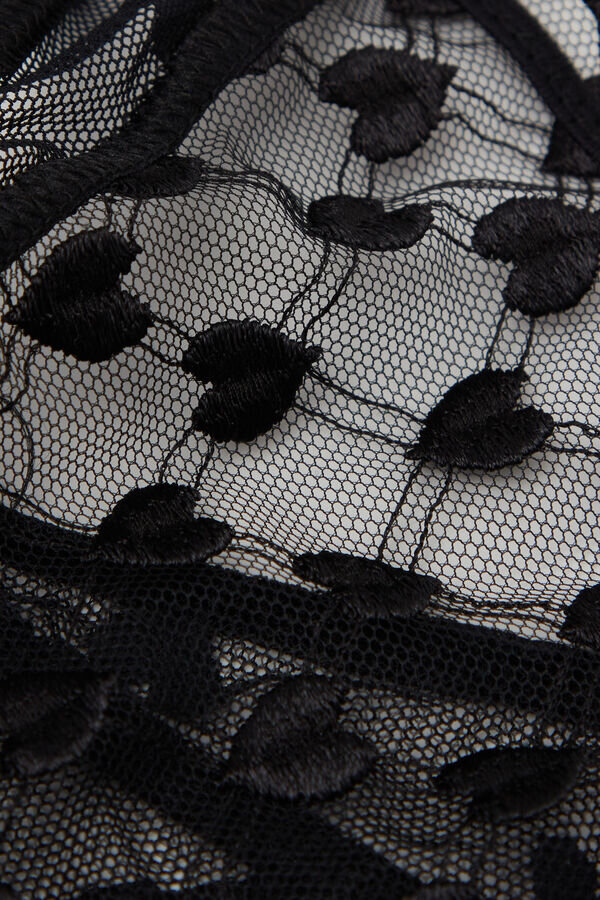 Brazilian majtki z romantycznym tiulem z haftowanym sercem, wykończone z tyłu falbanką w kształcie serca i satynowymi detalami. Satynowe ramiączka są odpinane i mogą służyć również jako figlarny choker lub ozdoba do włosów.