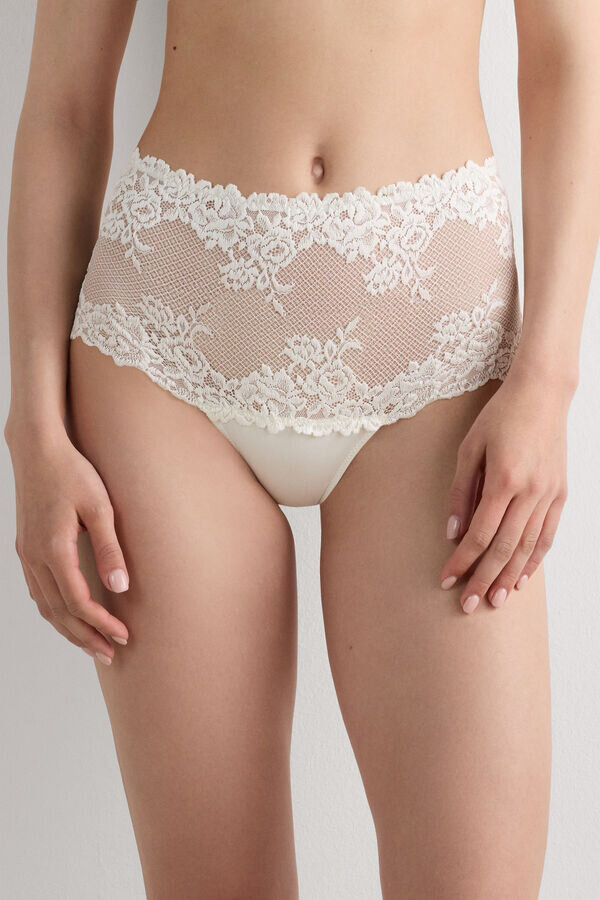 Brazilian hipster figs with a high waist, made of lace with a ruffle and soft microfiber in the lower portion. The lace can be in a contrasting color or a tone-on-tone color. High side cuts. Internal gusset in 100% cotton.