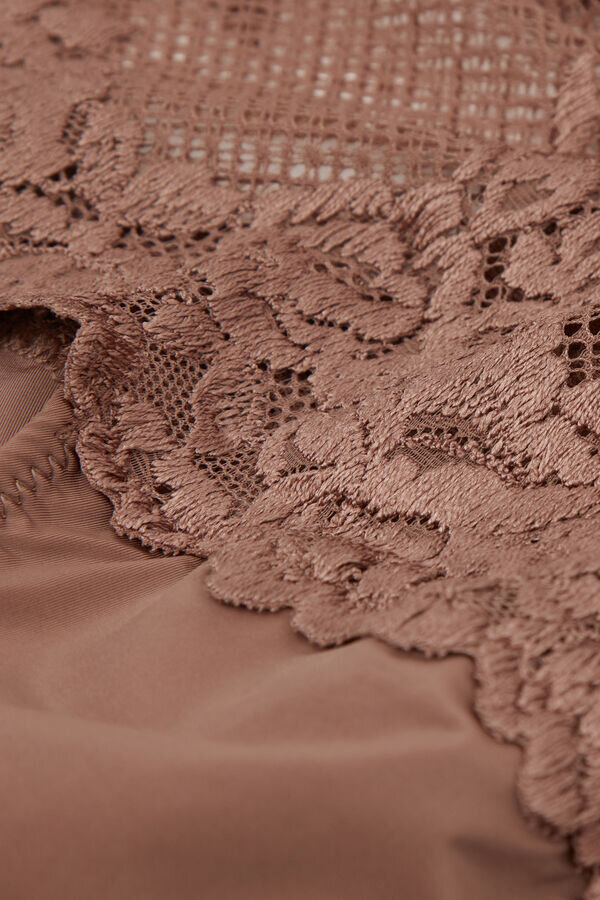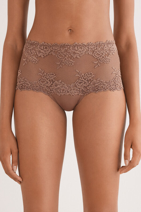 Brazilian hipster figs with a high waist, made of lace with a ruffle and soft microfiber in the lower portion. The lace can be in a contrasting color or a tone-on-tone color. High side cuts. Internal gusset in 100% cotton.