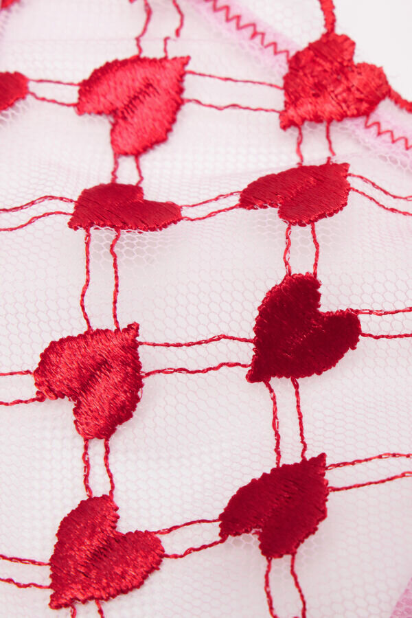 Thong z romantycznym tiulem z haftowanym sercem i zmysłową satynową lamówką. satynowy pasek jest odpinany i może służyć również jako figlarny choker lub ozdoba do włosów.