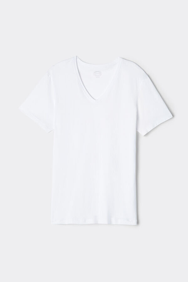 męska koszulka wykonana w 100% z najwyższej jakości bawełny extrafine, zaawansowanego technologicznie włókna najwyższej jakości, charakteryzującego się chłodnym i suchym w dotyku materiałem extrafine, który jest niezwykle lekki i oddychający oraz ma optymalną elastyczność. Wyjątkowość bawełny Extra Fine Superior przejawia się również w zachowaniu kształtu (doskonałe dopasowanie do sylwetki) i idealnym dopasowaniu, które zapewnia idealny krój. Idealna do noszenia jako bielizna lub samodzielnie. Informacje dla klienta: zakupiony produkt może mieć nowe logo Iuman Intimissimi Uomo, ale nadal będzie miał ten sam materiał, krój i wykończenie, co produkt przedstawiony na tej stronie.