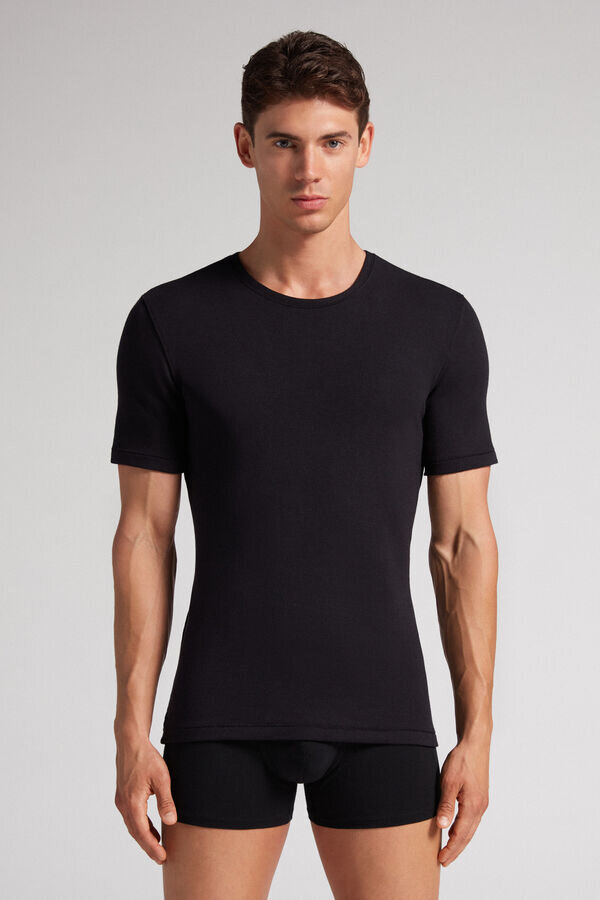 męska bluzka z krótkim rękawem i okrągłym dekoltem, wykonana z mieszanki modalu i kaszmiru. niezwykle miękka i wygodna. model ma 185 cm wzrostu i nosi rozmiar L. dostępna w sklepach Intimissimi man.