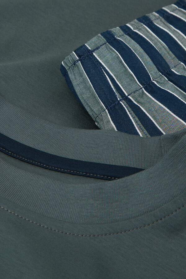 piżama z długimi nogawkami, składająca się z miękkiej, jednokolorowej koszuli z wysokiej jakości merceryzowanej bawełny, z kieszenią z kontrastową lamówką. spodnie z długimi nogawkami z bawełny o splocie płóciennym w paski.