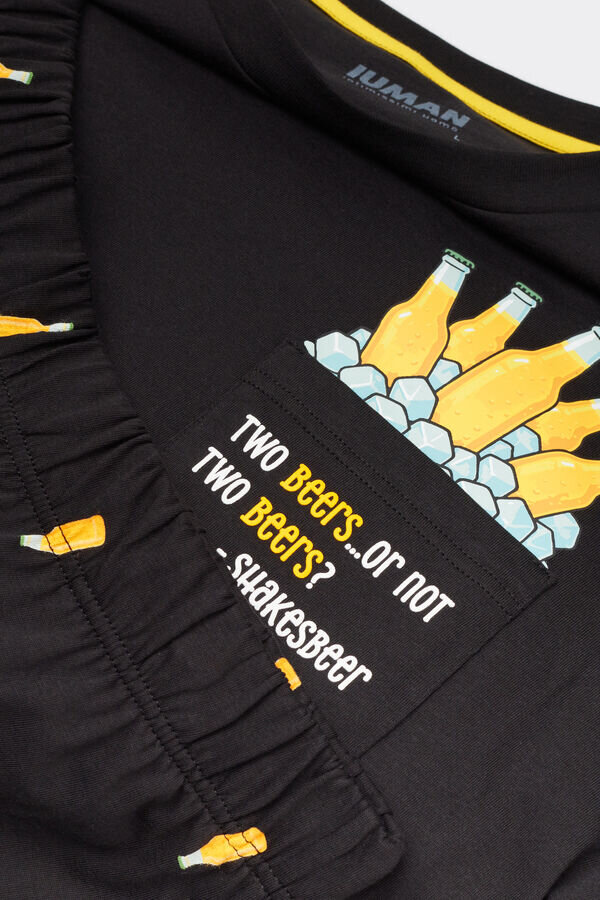 krótka piżama wykonana z bawełnianego dżerseju. Koszulka w jednolitym kolorze ma kieszeń ozdobioną zabawnym napisem i kilkoma wystającymi butelkami piwa. Spodenki mają nadruk butelek piwa na całej powierzchni.